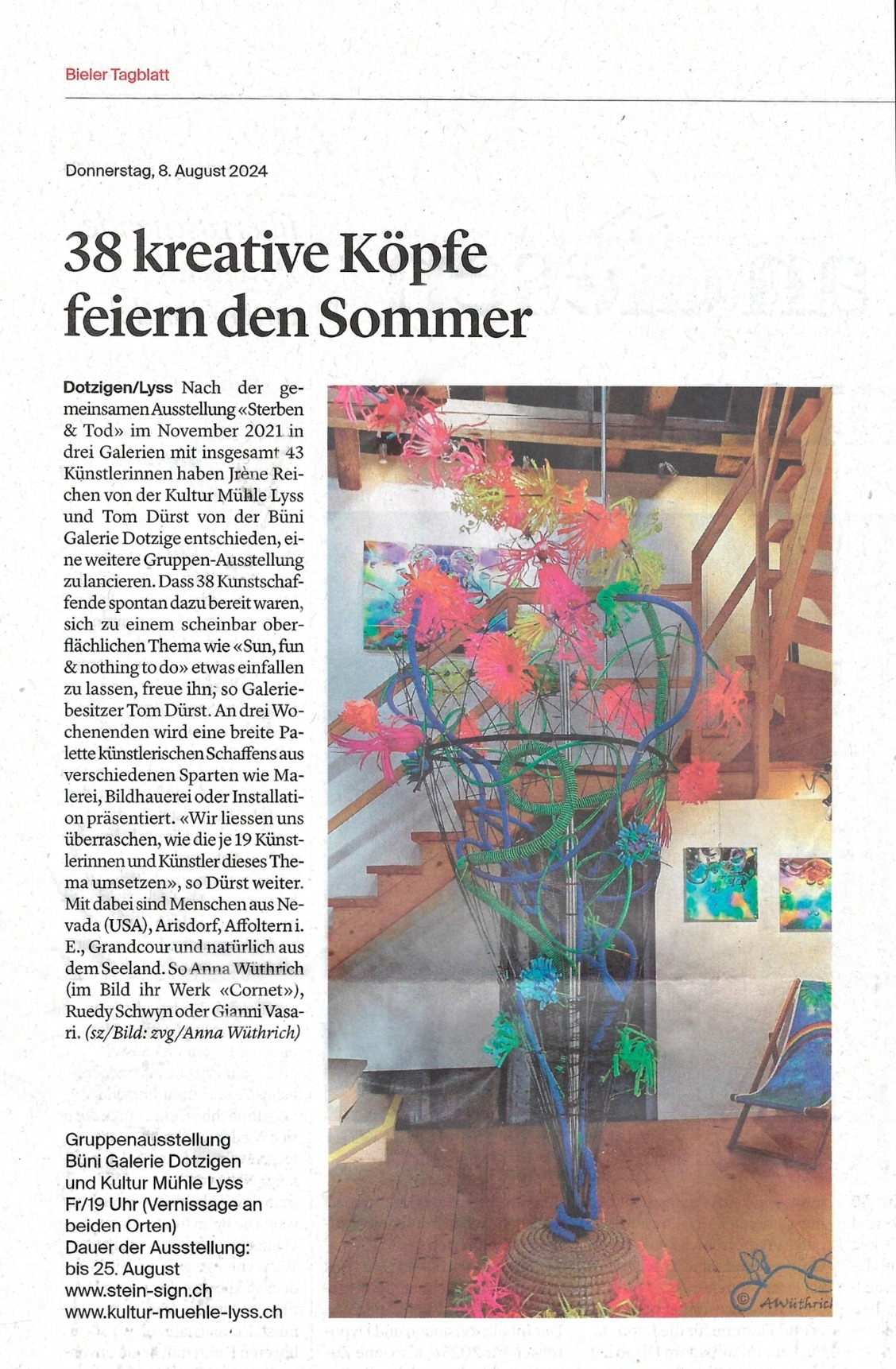 Anna Wüthrich, eine renommierte Foto-Künstlerin, die für ihre beeindruckenden Blumenbilder und die Serie „AWü70-Bubbles“ bekannt ist, präsentiert ihre neueste Recycling Art Installation in der Bühni Gallerie an der Bührenstrasse 8 in Dotzigen. Das Kunstwerk trägt den Namen „Cornet“, inspiriert von der Form einer Eiswaffel, und reflektiert das Thema der Ausstellung: „SUN FUN AND NOTHING TO DO“.